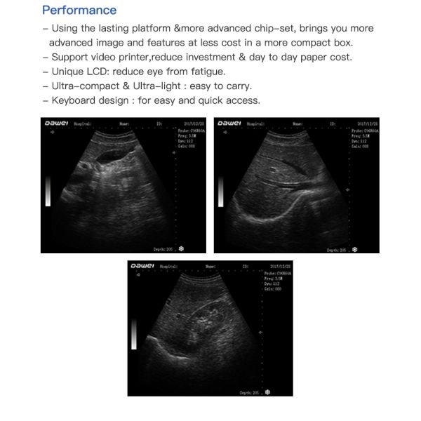| Options | 6.5Mhz Transvaginal Probe, 3.5Mhz Micro-convex Probe, Trolley, Printers, Biopsy kit,Aluminum case |